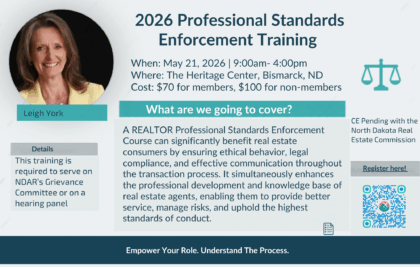 May Professional Standards Enforcement Training is now open! A total of 6 hours is offered. This training is required to serve on NDAR’s Grievance Committee or on a hearing panel.